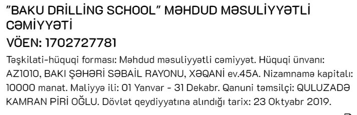 Azərbaycan Vergilər Nazirliyi tərəfindən 10 min manat nizamnamə kapitalı ilə "Baki Drilling Shcool" MMC qeydiyyata alınıb.