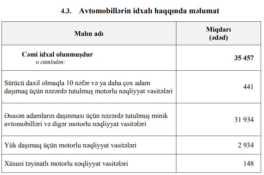 2019-cu ilin yanvar-oktyabr ayları ərzində (10 ayda) Azərbaycana 35 min 457 ədəd cəmi nəqliyyat vasitələri (avtomobillər) idxal olunub.