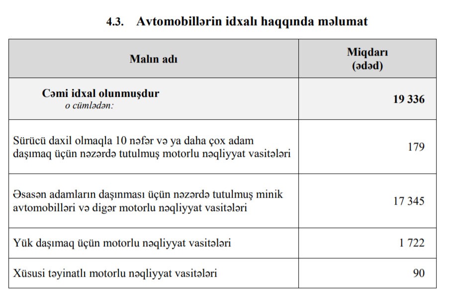O cümlədən, 2019-cu ilin yanvar-oktyabr aylarında Azərbaycana 31 min 934 ədəd minik avtomobili, 441 ədəd avtobus, 2 min 934 ədəd yük avtomobili və 148 ədəd xüsusi təyinatlı vasitə idxal olunub.