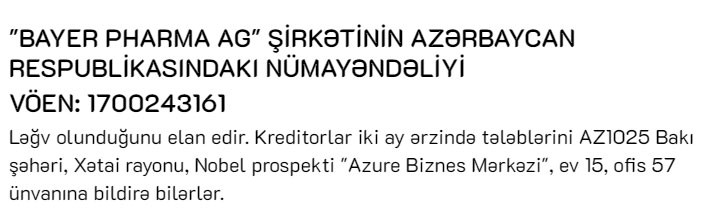 "Bayer Pharma AG" şirkətinin Azərbaycan Respublikasındakı nümayəndəliyi ləğv olunduğunu elan edib.