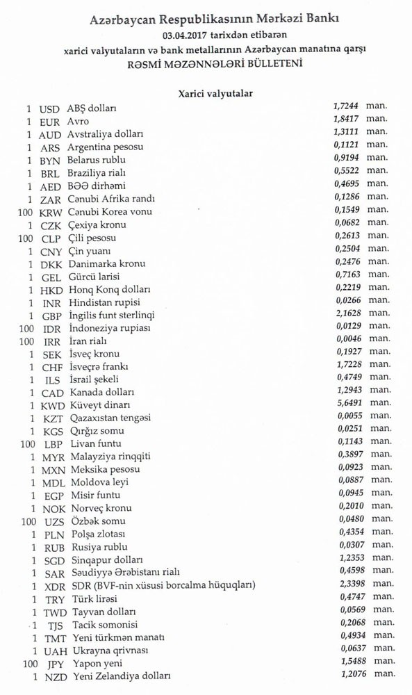 Aprelin 3-nə Mərkəzi Bankın açıqladığı rəsmi Dollar/manat məzənnəsi Martın 31-i ilə müqayisədə dəyişməyərək 1,7244 manat olub, Avro/manat məzənnəsi isə 1.8417 manata qalxıb.