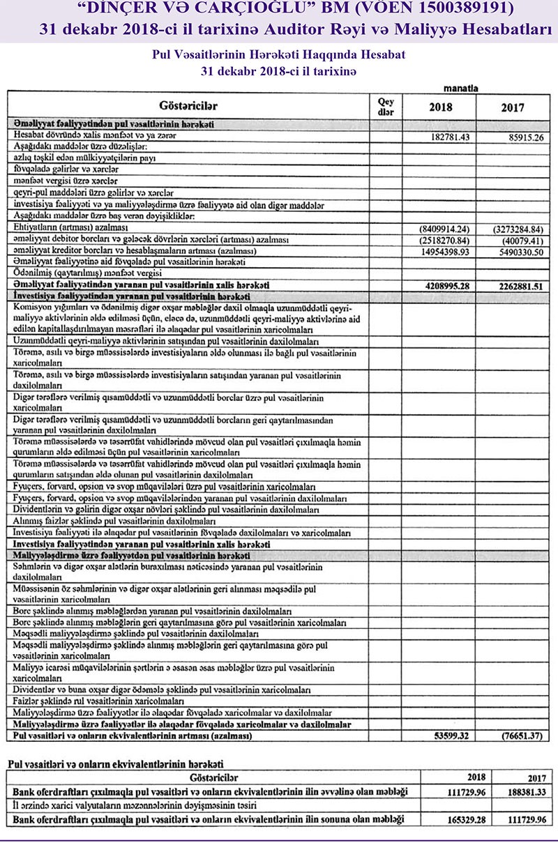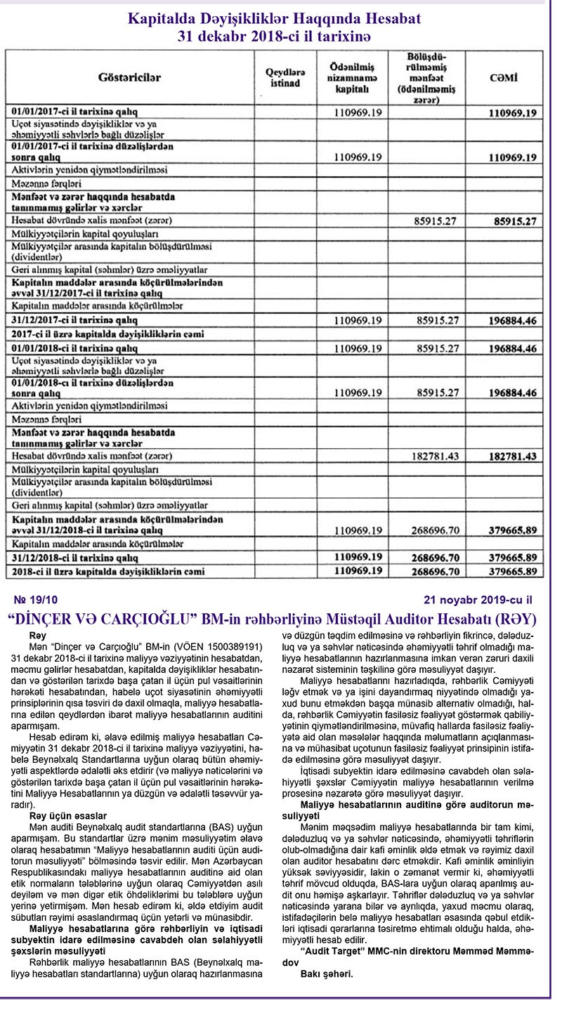 Mebel, mebel aksesuarları, parket, laminat, qapı və digər taxta məhsullarının satışı ilə məşğul olan “Dinçer və Carçıoğlu” Birgə Müəssisəsi 2018-ci ili təxminən 183 min manat xalis mənfəət ilə başa vurub. Müqayisə edək ki, şirkət 2017-ci ili 86 min manat xalis mənfəət ilə bağlamışdı.
