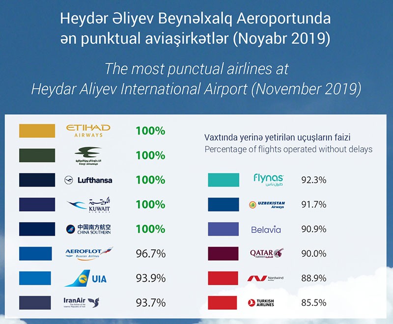 Heydər Əliyev Beynəlxalq Aeroportunun yaydığı məlumata görə, 5 aviaşirkət – “Etihad Airways”, “Iraqi Airways”, “Lufthansa”, “Kuwait Airways” və “China Southern” Bakıdan uçarkən ən yüksək nəticəyə - 100% punktuallığa nail olmuşdurlar.