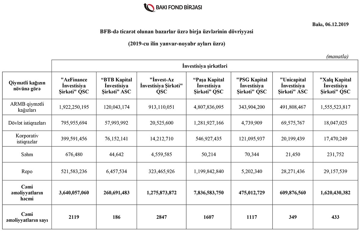 “Marja” Bakı Fond Birjasına istinadən xəbər verir ki, 7 milyard 837 milyon manat dövriyyə ilə “PAŞA Kapital İnvestisiya Şirkəti” 1-ci, 3 milyard 640 milyon manat dövriyyə ilə "AzFinance İnvestisiya Şirkəti" 2-ci, 1 milyard 620 milyon manat dövriyyə ilə "Xalq Kapital İnvestisiya Şirkəti" 3-cü, 1 milyard 275 milyon manat dövriyyə ilə "İnvest-Az İnvestisiya Şirkəti" 4-cü yeri tutub.