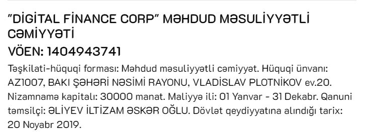 Vergilər Nazirliyi "Digital Finance Corp" MMC-ni dövlət qeydiyyatına alıb.