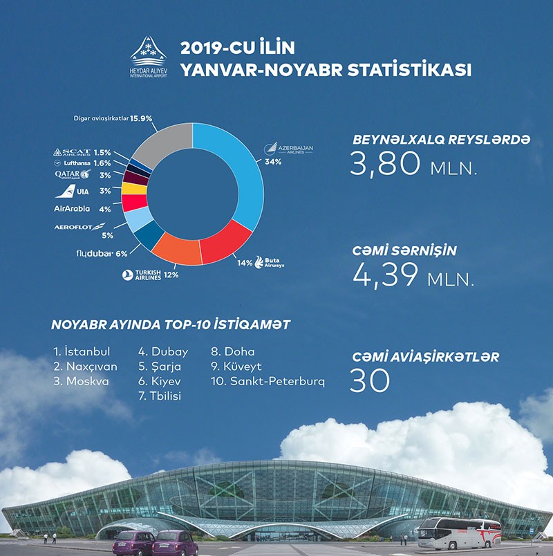 Heydər Əliyev Beynəlxalq Aeroportunun mətbuat xidmətinin yaydığı məlumata görə, bunun 4,39 milyonu Heydər Əliyev Beynəlxalq Aeroportunun payına düşür ki, bu da ötən ilin göstəricisindən 6% çoxdur.