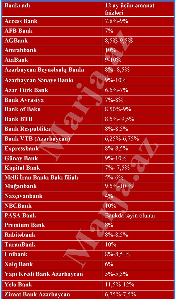Hazırda 12 ay müddəti üzrə ən yüksək əmanət faizləri Yelo Bank, Amrahbank, Azərbaycan Sənaye Bankı, AtaBank, GünayBank, Muğanbank, NBCBank və Turanbankdadır.