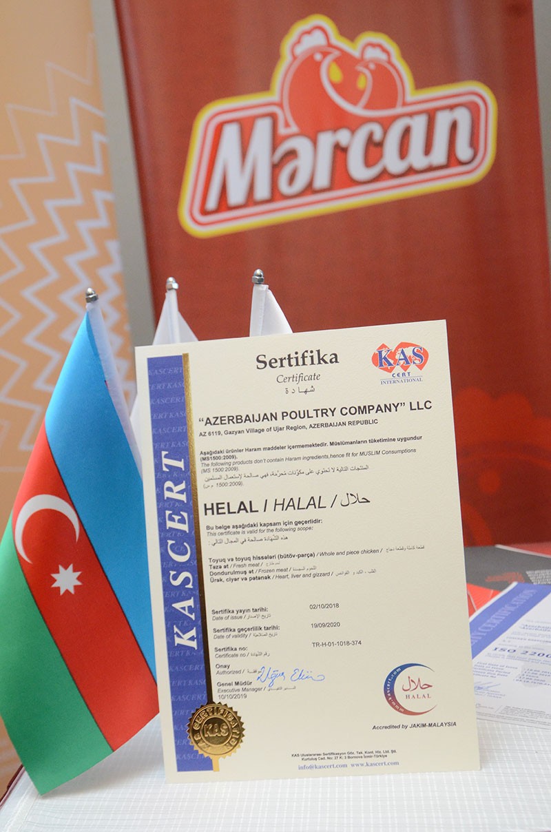 Mərasimdə qeyd olunub ki, 2018-ci idən etibarən “Mərcan” məhsullarının istehsalına qida təhlükəsizliyi və halal standartlar üzrə aparıcı mütəxəssisləri tərəfindən ciddi nəzarət və məsləhət layihəsi başlanıb. Həmin layihə çərçivəsində şirkətin struktur bölmələrində, o cümlədən Ucar rayonunda yerləşən quş ətinin emalı fabrikində diaqnostik audit və mövcud idarəetmə sisteminin təhlili aparılıb, müəssisənin əməkdaşlarına qeyd olunan standartlar üzrə müvafiq təlimlər keçirilib. Həmin auditlərin nəticəsi olaraq APC-nın ISO 22000 və Halal standartların tələblərinə uyğunluğu barədə müsbət rəy verilib və şirkətin fəaliyyəti ISO 22000 standartı üzrə Almaniyanın “DAKKS” akkreditasiyalı sertifikatı və dünyanın halal standartlar üzrə ən nüfuzlu sertifikatlaşdırma orqanlarından biri olan - Malayziyanın "JAKIM" təşkilatının təsdiq etdiyi HALAL sertifikatı ilə təsdiqlənib.