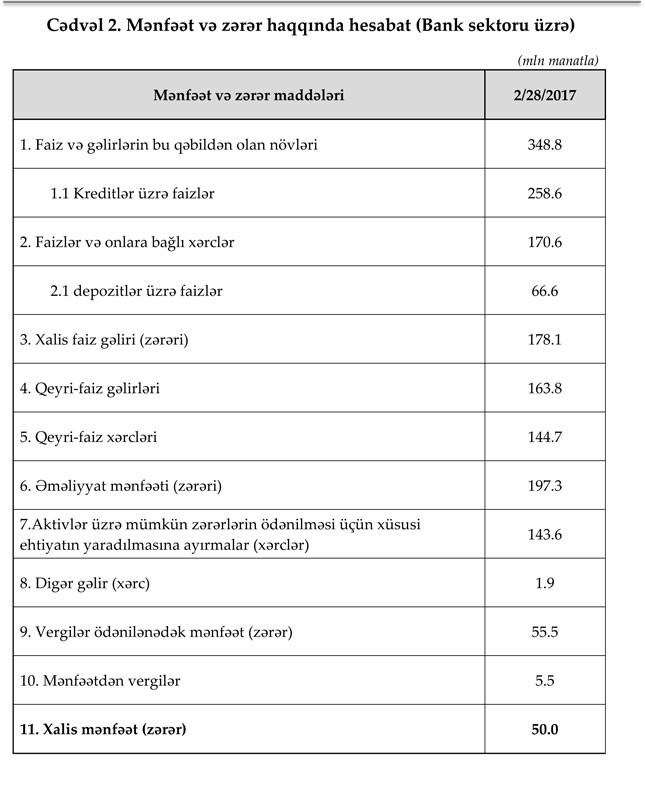 2017-ci ilin 28 fevral tarixinə olan bank sektorunun əsas göstəriciləri bank sektorunun icmal göstəricilərində öz əksini tapmışdır.