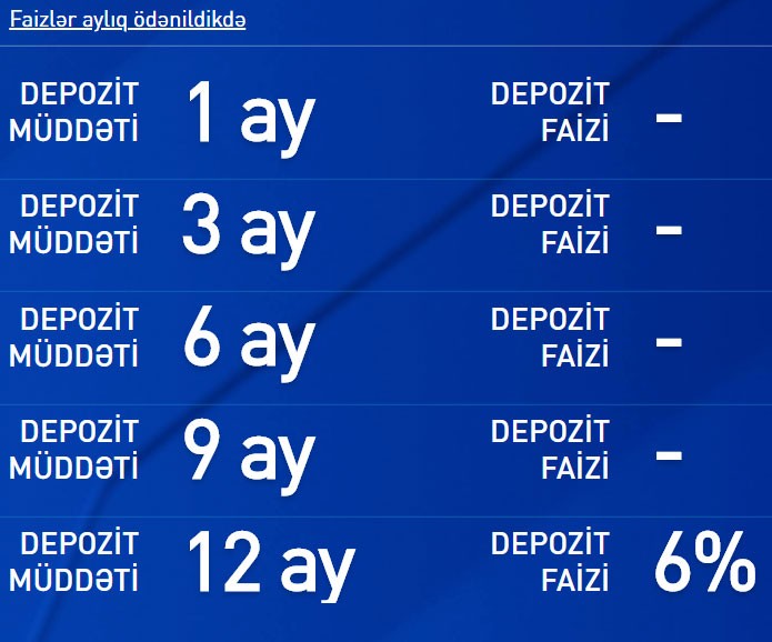 “Marja” xəbər verir ki, faiz dərəcəsi 3 faiz bəndi azaldılıb. Belə ki, illik faiz dərəcəsi “faizlər aylıq ödənildikdə” şərti üzrə 9%-dən 6%-ə, “faizlər müddət sonunda ödənildikdə” şərti üzrə isə 10%-dən 7%-ə endirilib.