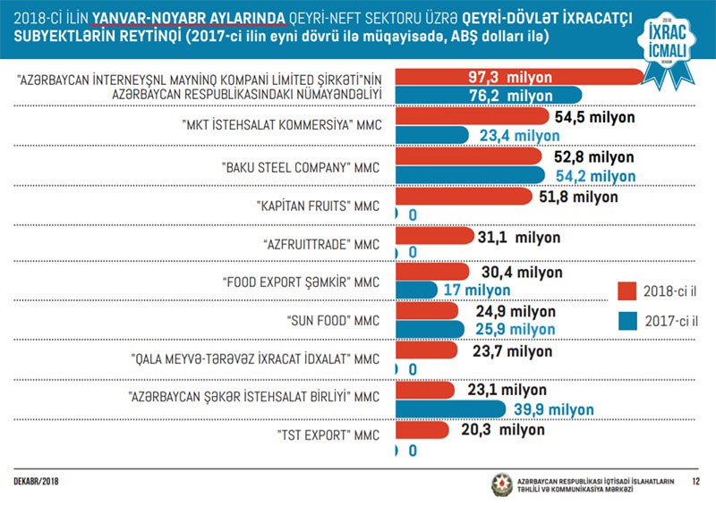 2019-cu ilin yanvar-noyabr ayları üzrə hazırlanan qeyri-dövlət ixracatçı subyektlərin reytinqində ilk onluqda hər birinin 11 aylıq ixracı 22,5 milyon dollardan yüksək olan şirkətlər təmsil olunub. Ötən ilin eyni dövrü üzrə hazırlanmış siyahıda hər birinin 11 aylıq ixracı 20,3 milyon dollardan yüksək olan şirkətlər təmsil olunmuşdu. Ötən ilin 11 ayında 51,8 milyon dollar ixracı olan "Kapitan Fruits" MMC-nin, 31,1 milyon dollar ixracı olan “Azfruittrade” MMC-nin, 30,4 milyon dollar ixracı olan “Food Export Şəmkir” MMC-nin ilk onluqdan çıxması diqqəti xüsusi cəlb edir.