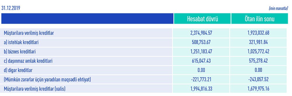 “Marja” Bankın maliyyə göstəricilərinə istinadən xəbər verir ki, 2018-ci ilin sonunda müştərilərə verilmiş kreditlər 1 milyard 923 milyon 32 min manat ikən 2019-cu ilin sonunda 2 milyard 374 milyon 984 min manata çatıb.