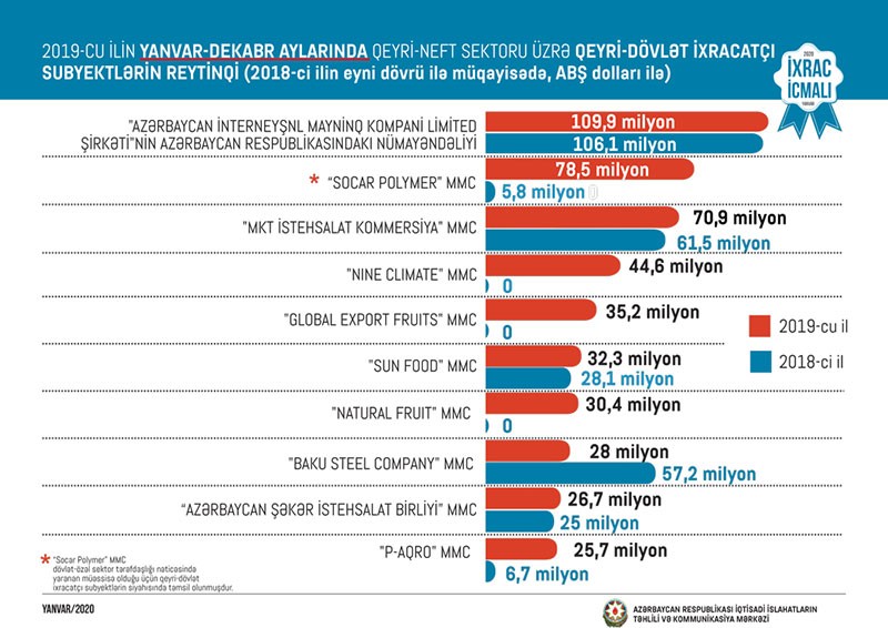 2019-cu ilin yanvar-dekabr ayları üzrə hazırlanan qeyri-dövlət ixracatçı subyektlərin reytinqində ilk onluqda aşağıdakı subyektlər təmsil olunurlar: "Azərbaycan İnterneyşnl Mayninq Kompani Limited Şirkəti"nin Azərbaycan Respublikasındakı nümayəndəliyi, “Socar Polymer” MMC, "MKT İstehsalat Kommersiya" MMC, "Nine Climate" MMC, "Global Export Fruits" MMC, “Sun Food" MMC, "Natural Fruit" MMC, "Baku Steel Company", "Azərbaycan Şəkər İstehsalat Birliyi " MMC, "P-Aqro" MMC.