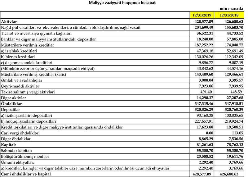 Müqayisə üçün qeyd edək ki, 2018-ci ildə “Yapı Kredi Bank Azərbaycan”ın cəmi faiz və qeyri-faiz gəlirlləri 51 milyon 950 min manat, faiz və qeyri-faiz xərcləri 34 milyon 561 min manat, əməliyyat mənfəəti 17 milyon 389 min manat, mümkün zərərlər üçün yaradılan məqsədli ehtiyatlara ayırma 10 milyon 48 min manat, ödənilmiş mənfəət vergisi 1 milyon 954 min manat təşkil etmişdi.