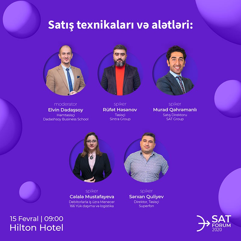 SAT Forum Satış texnikaları və alətləri, Satış idarəetməsi üzrə 2 paneldən ibarət olacaq. Hər paneldə 1 moderator və 4 spiker olmaqla toplamda 10 nəfər ekspert çıxış edəcək: