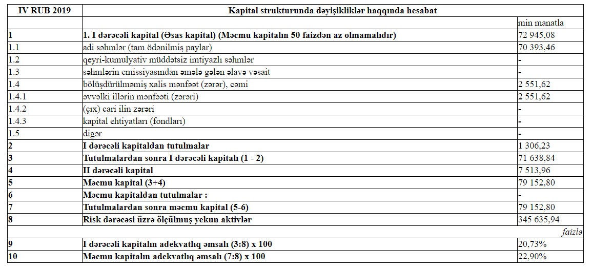 31 Dekabr 2019-cu il tarixində “AFB Bank” 79 milyon 152 min manat məcmu kapitala malik olub.