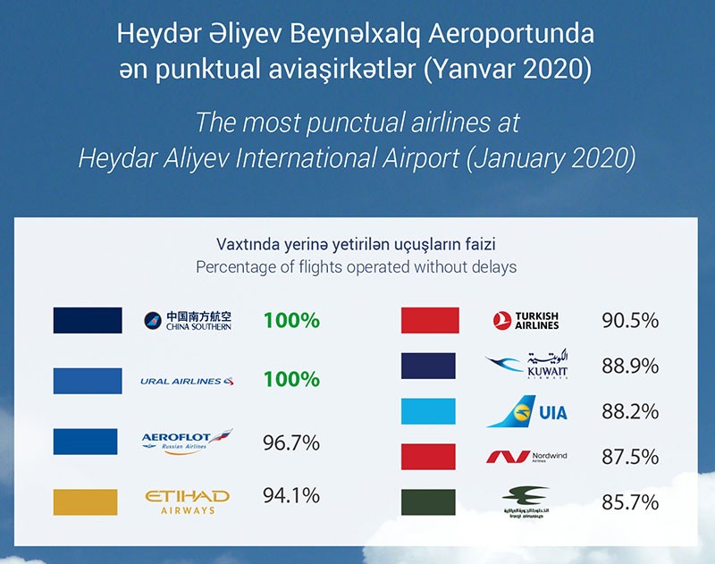Heydər Əliyev Beynəlxalq Aeroportunun mətbuat xidmətinin yaydığı məlumatda bildirilir ki, 2020-ci ilin yanvar ayı ərzində Bakıdan yola düşərkən “China Southern” (Çin) və “Ural Hava Yolları” (Rusiya) 100% punktuallıq göstəriblər.