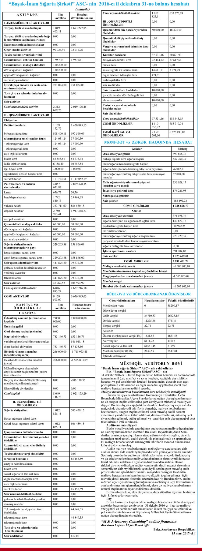 “Marja” Şirkətin maliyyə hesabatlarına istinadən xəbər verir ki, ötən il “Başak-İnam”ın cəmi gəlirləri 1 milyon 386 min manat, cəmi xərcləri isə 2 mlyon 891 min manat təşkil edib. Nəticədə Şirkət 2016-cı ili 1 milyon 506 min manat zərər ilə başa vurub. “Başak-İnam” 2015-ci ilin yekunları üzrə 266 min manat xalis mənfəət açıqlamışdı.