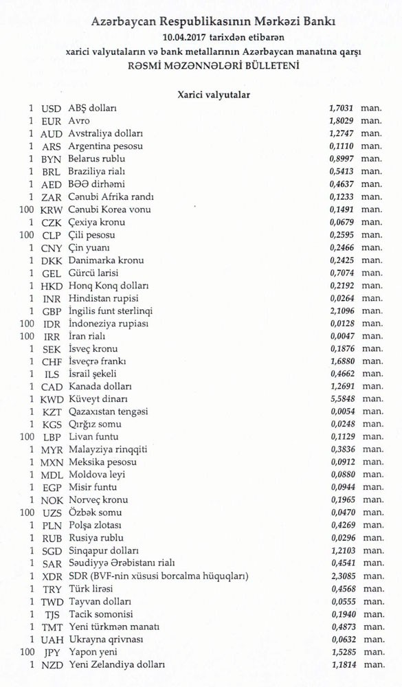 Aprelin 10-na Mərkəzi Bankın açıqladığı rəsmi Dollar/manat məzənnəsi Aprelin 7-si ilə müqayisədə dəyişməyərək 1,7031 manat olub, Avro/manat məzənnəsi isə 1.8029 manata düşüb.