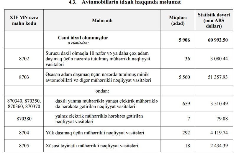 2020-ci ilin Yanvar ayında Azərbaycana 60 milyon 992 min dollar dəyərində 5 906 ədəd avtomobil idxal edilib.