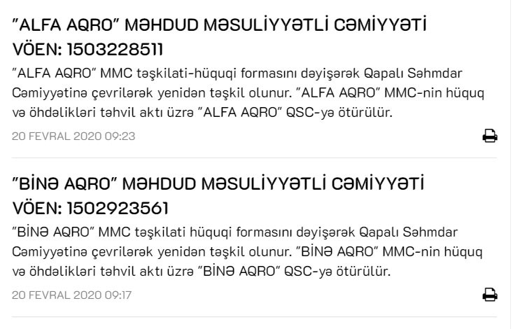 "Alfa Aqro" MMC və "Binə Aqro" MMC şirkətləri təşkilati-hüquqi formanı dəyişərək Qapalı Səhmdar Cəmiyyətinə (QSC) çevrilərək yenidən təşkil olunduqlarını elan ediblər.
