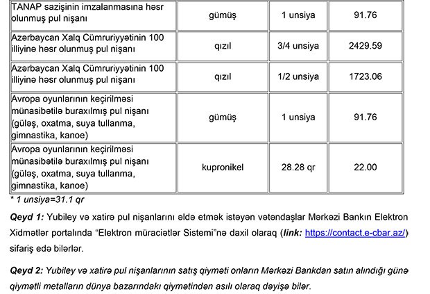 Qeyd etmək istərdik ki, Mərkəzi Bank tərəfindən satışda olan yubiley və xatirə pul nişanları barədə məlumatlar Mərkəzi Bankın rəsmi internet səhifəsində "Milli pul nişanları" bölməsində yerləşdirilir.
