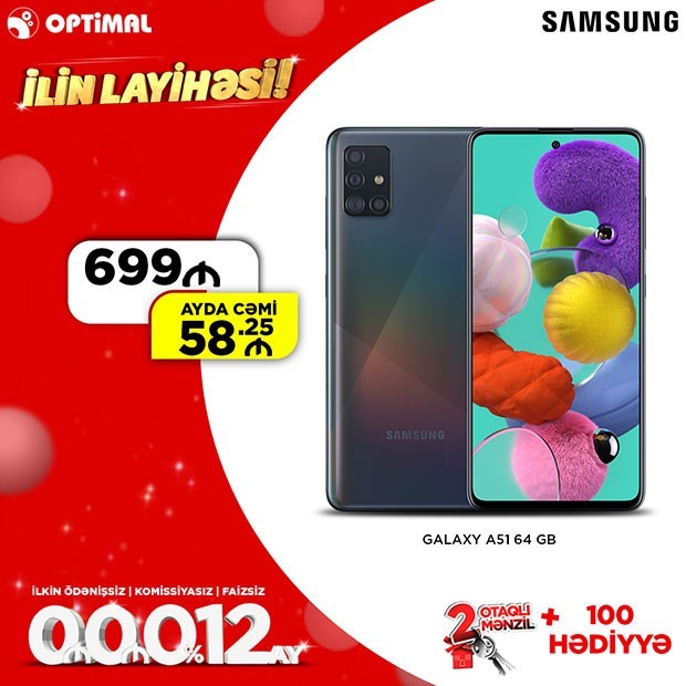 - Samsung Galaxy A51 (4/64 GB, dördlü kamera) modelinə ayda 58.25 azn,