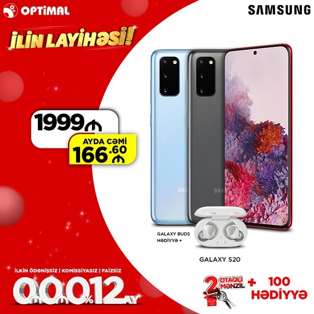 -Samsung Galaxy S20 (8/128 GB, üçlü kamera) modelinə ayda cəmi 166.60 azn ödəməklə ilkin ödənişsiz, faizsiz, komissiyasız 12 aylıq kredit şərtləri ilə sahib olabilərsiniz.