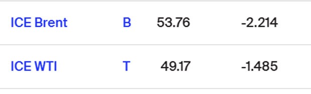 Brent neftinin qiyməti 53.76 dollara (-2,2% azalma), ABŞ xam neftinin qiyməti isə 49.17 dollara (-1.4% azalma) geriləyib (Bakı vaxtı ilə saat 16:15-ə olan məlumat).