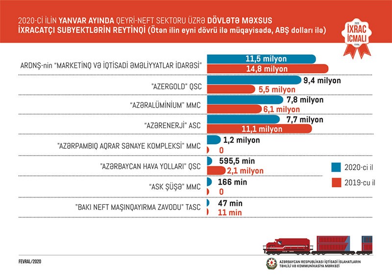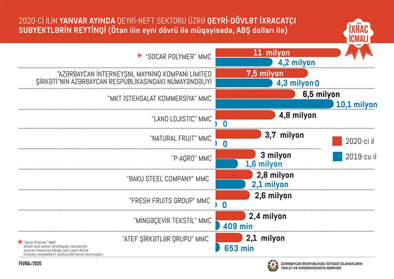 2020-ci ilin yanvar ayı üzrə hazırlanan qeyri-dövlət ixracatçı subyektlərin reytinqində ilk onluqda aşağıdakı şirkətlər təmsil olunurlar: “Socar Polymer” MMC, "Azərbaycan İnterneyşnl Mayninq Kompani Limited Şirkəti"nin Azərbaycan Respublikasındakı nümayəndəliyi, "MKT İstehsalat Kommersiya" MMC, " Land Lojistic" " MMC, "Natural Fruit" MMC, "P-Aqro" MMC, "Baku Steel Company", "Fresh Fruits Group" MMC, "Mingəçevir Tekstil" MMC, Atef Şirkətlər Qrupu" MMC.