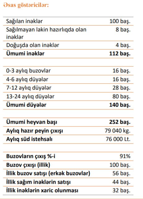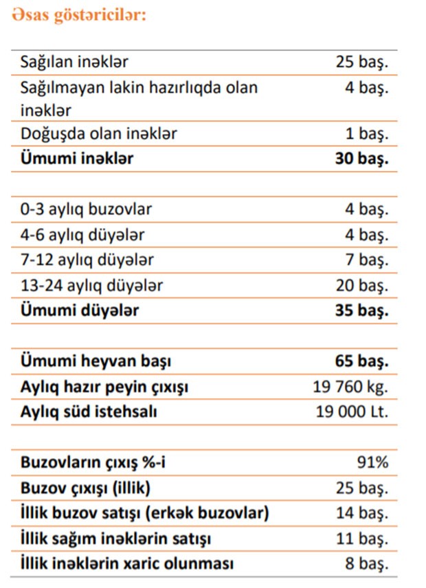 “Bu layihə yüksək təcrübəli memar-konstruktorlar və texnoloqlarla birlikdə hazırlanmışdır və kiçik fermerlər üçün nəzərdə tutulmuşdur. Layihələndirmə və tikintini tərəfimizdən aparılmasına görə layihənin qiyməti optimallaşdırmışdır ki, bu da fermerlər üçün qoyulan sərmayəni qısa müddətində geri qaytarılmasına zamin yaradır. Layihələndirilmədə və tikintidə istifadə edilən materiallar yüksək keyfiyyətli materiallardan hazırlanır və bir il ərzində istismarına zəmanət tərəfimizdən verilir. Fermerlərin süd istehsalı həcmini stabil saxlamaq üçün sağım inəkləri daimi yenilənməlidir. Bunun üçün layihədə süd verən inəklərin yetişdirməsi nəzərdə tutulmuşdur”,- şirkətin layihə təqdimatında bildirilir.
