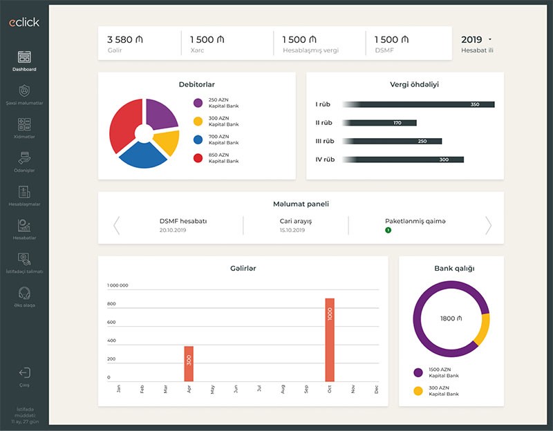 - Proqramın avtomatik tərtib etdiyi məlumat panelində (dashboard) aylar üzrə gəlirlərinizi, bank hesabı qalıqlarınızı, təqdim etdiyiniz xidmətlərə görə (şirkətlər üzrə ayrı-ayrılıqda) sizə ödəniləcək məbləğləri, ödənilməli vergi borclarınızı və s. görə bilərsiniz