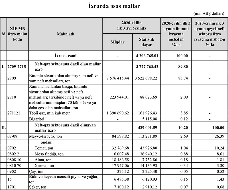 2020-ci ilin ilk 3 ayı ərzində neft-qaz sektoruna daxil olan mallar üzrə Azərbaycana 3 milyard 777 milyon dollar valyuta daxil olub.