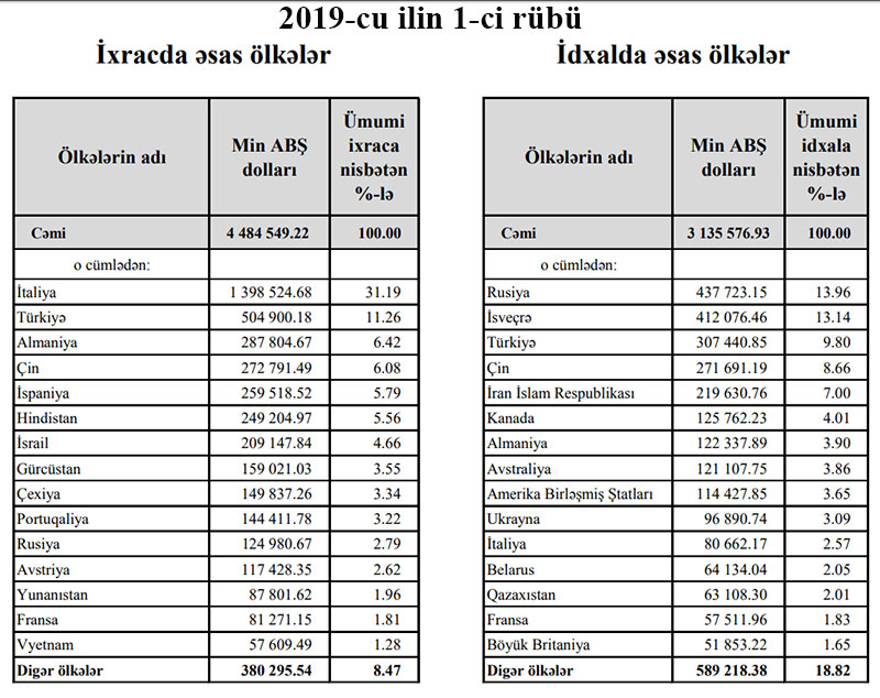 2020-ci ilin ilk rübündə Azərbaycana Rusiyadan 433 milyon 713 min dollarlıq mallar idxal olunub. Bu, ötən ilin eyni dövrü ilə müqayisədə 4 milyon 10 min dollar azdır. 2019-cu ilin 1-ci rübündə Rusiyadan 437 milyon 723 min dollarlıq idxal həyata keçirilmişdi.