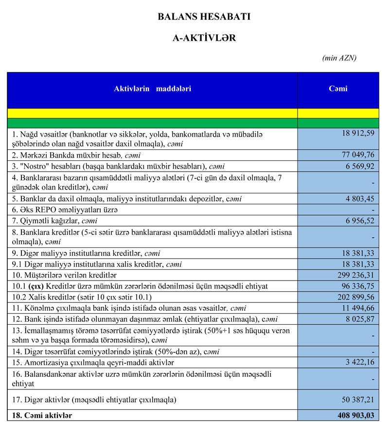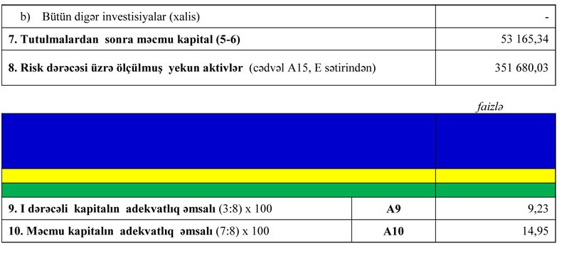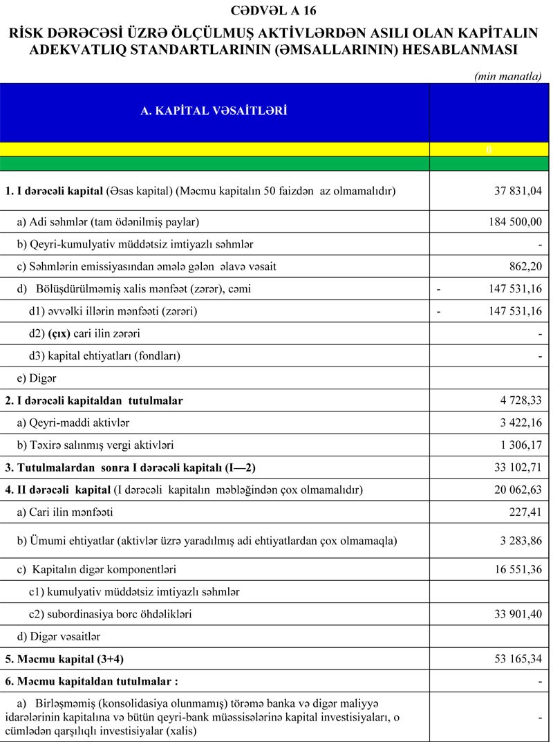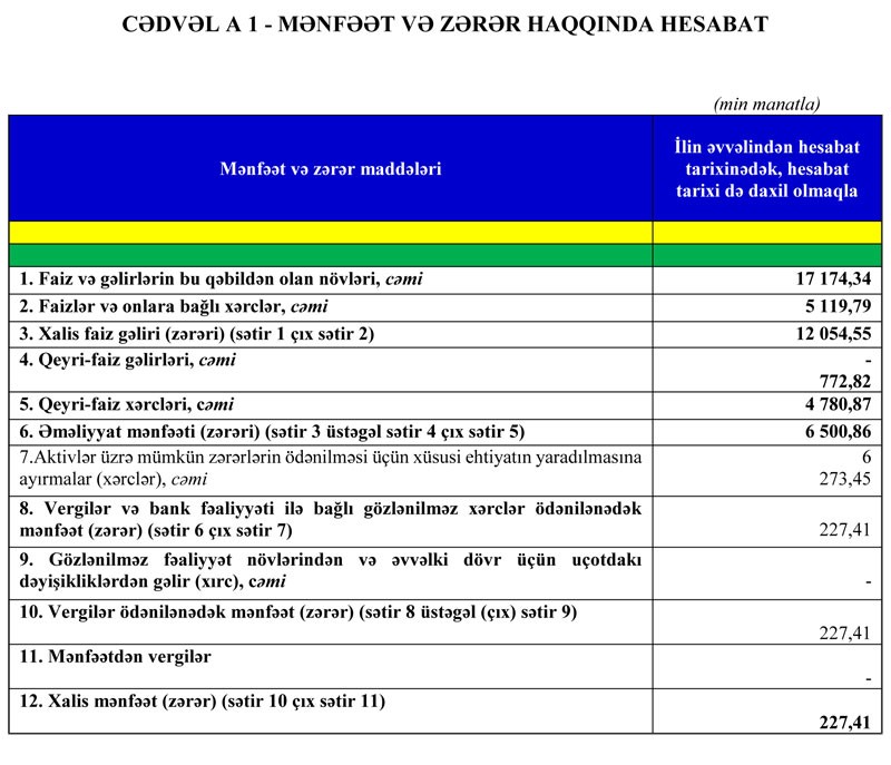 Faiz və qeyri-faiz xərcləri çıxıldıqdan sonra Bankın 6 milyon 501 min manat əməliyyat mənfəəti qalıb. Əməliyyat mənfəətinin 6 milyon 273 min manatı aktivlər üzrə mümkün zərərlərin ödənilməsi üçün xüsusi ehtiyatın yaradılmasına ayırılıb. Nəticədə Bank ilk rübü 227,41 min manat xalis mənfəət ilə başa vurub.