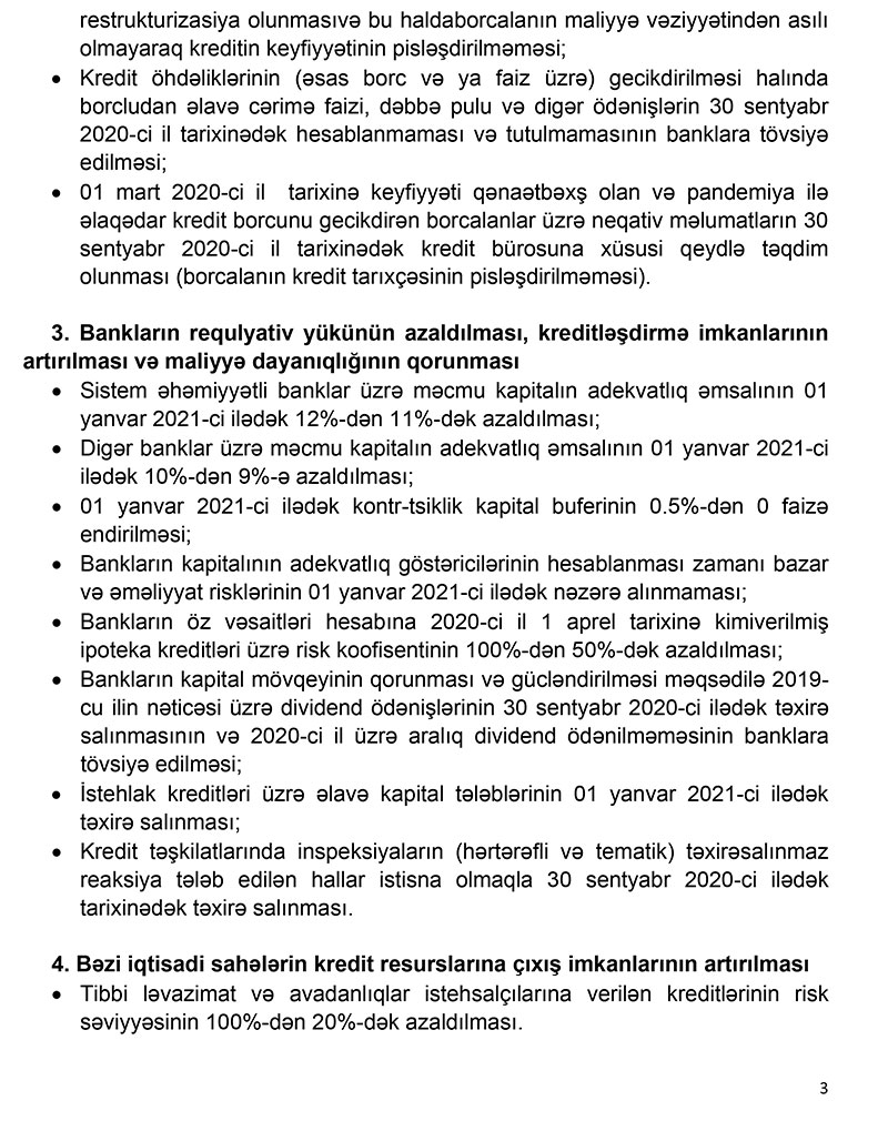Qeyd olunan tədbirlərin həyata keçirilməsinə şərait yaratmaq, biznes və əhaliyə maliyyə xidmətlərinin davamlılığını təmin etmək, kreditləşdirmə imkanlarının artırılması üçün banklara əvvəlki dövrlərdə toplanmış dayanıqlıq yastığından istifadə etməyə imkan yaradılması məqsədilə requlyativ yükün azaldılması istiqamətində tədbirlər nəzərdə tutulur.