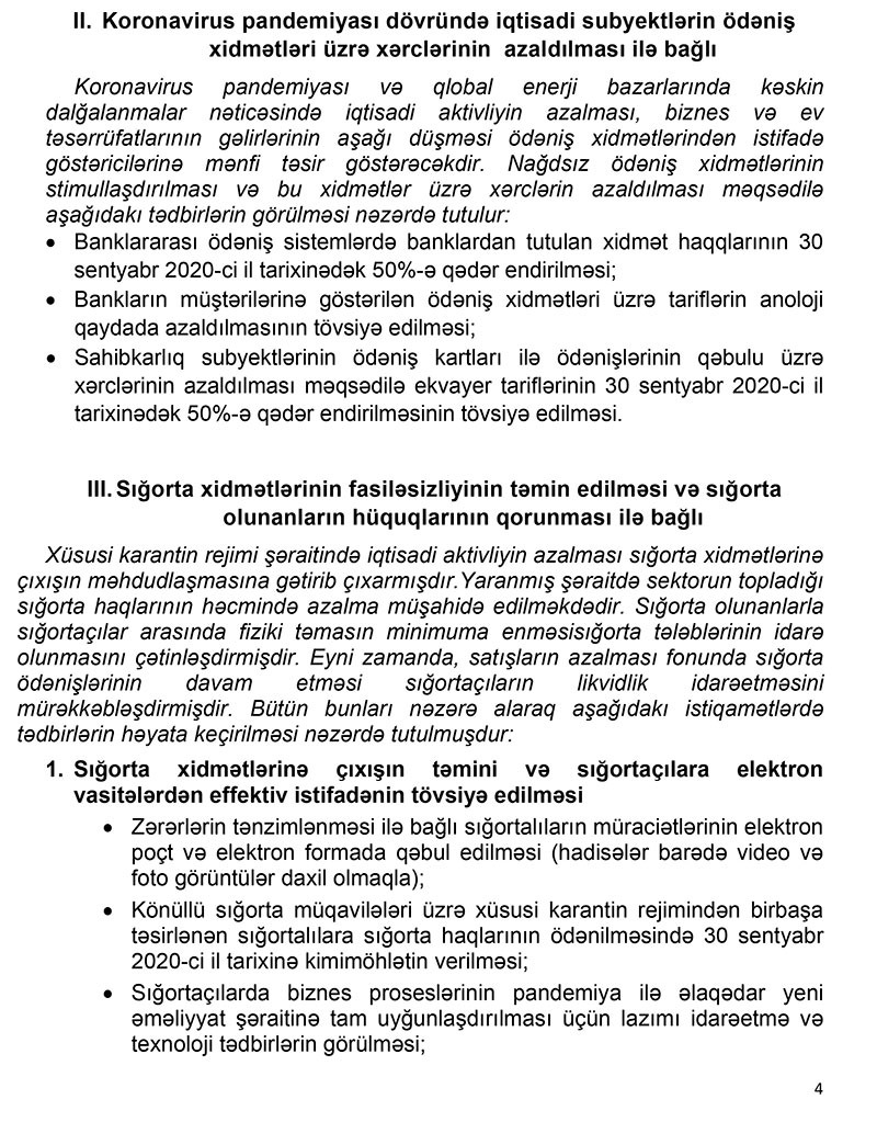 İqtisadi aktivliyin azalması, biznes və ev təsərrüfatlarının gəlirlərinin aşağı düşməsinin ödəniş xidmətlərindən istifadə göstəricilərinə mənfi təsir etməsini nəzərə alaraq nağdsız ödəniş xidmətlərinin stimullaşdırılması və xərclərin azaldılması məqsədilə 30 sentyabr 2020-ci il tarixinədək banklararası ödəniş sistemlərində banklardan tutulan xidmət haqlarının 50%-ə qədər endirilməsi və bank müştərilərinə göstərilən ödəniş xidmətləri üzrə tariflərin analoji qaydada azaldılması, eləcə də sahibkarların ödəniş kartlarının qəbulu üzrə tariflərinin 50%-ə qədər endirilməsi tədbirləri nəzərdə tutulur.