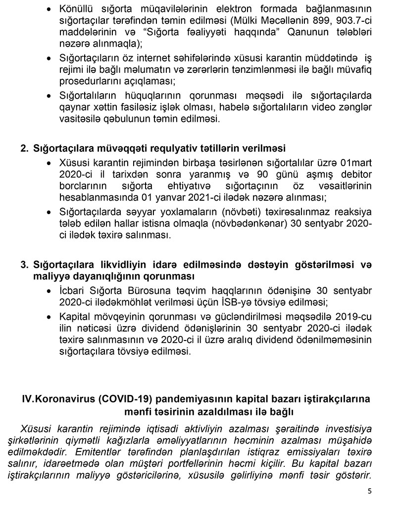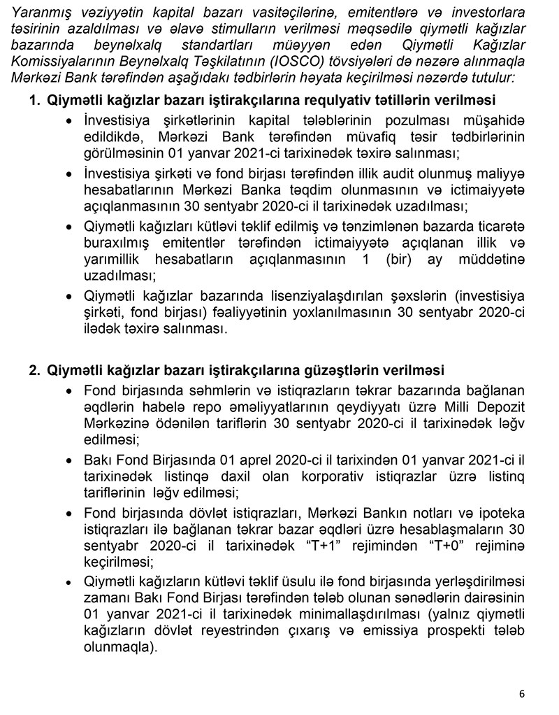 Eyni zamanda, Milli Depozit Mərkəzinə səhm və istiqrazlarla təkrar bazarda bağlanan əqdlər habelə repo əməliyyatlarının qeydiyyatı üzrə tariflərin 30 sentyabr 2020-ci ilədək investorlardan tutulmaması, Bakı Fond Birjasına isə emitentlərdən korporativ istiqrazlar üzrə listinq tariflərini 1 yanvar 2021-ci il tarixinədək tutulmaması və qiymətli kağızların kütləvi təklif üsulu ilə yerləşdirilməsi zamanı tələb olunan sənədlərin sayının minimallaşdırılması tövsiyə ediləcəkdir.