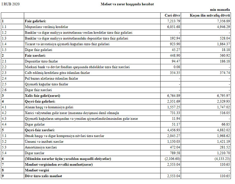 Müqayisə üçün qeyd edək ki, 2019-cu ilin 1-ci rübündə AFB Bankın cəmi əməliyyat mənfəəti 9 milyon 685 min manat, cəmi əməliyyat xərcləri 5 milyon 442 min manat, əməliyyat mənfəəti 4 milyon 243 min manat təşkil etmişdi. Bank mümkün zərərlər üçün yaradılan məqsədli ehtiyatlara 4 milyon 133 min manat ayırdığı üçün həmin dövrü 111 min manat xalis mənfəət ilə başa vurmuşdu.