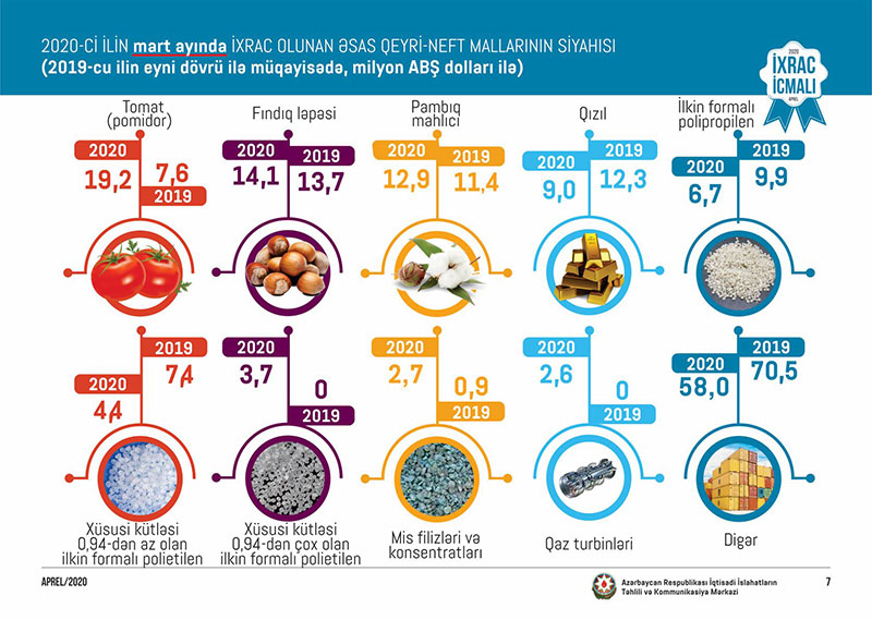2020-cu ilin mart ayında qeyri-neft sektoru üzrə ixracda tomat (pomidor - 19,2 milyon ABŞ dolları) birinci, qabığı təmizlənmiş meşə fındığı (14,1 milyon ABŞ dolları) ikinci, pambıq mahlıcı (12,9 milyon ABŞ dolları) üçüncü yerdə qərarlaşıb.