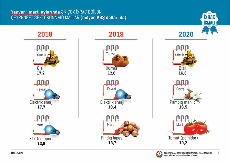 2020-ci ilin yanvar-mart ayları ərzində ixrac edilən qeyri-neft sektoruna aid malların siyahısında isə pomidor (43,9 milyon ABŞ dolları) birinci, pambıq mahlıcı (42,8 milyon ABŞ dolları) ikinci və qızıl (sikkə kəsilməsində istifadə olunmayan, digər emal olunmamış formalarda – 36,3 milyon ABŞ dolları)üçüncü olub.