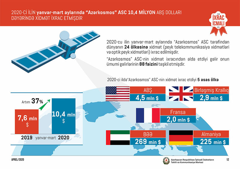 Məlumat verilib ki, 2020-ci ilin yanvar-mart aylarında “Azərkosmos” ASC tərəfindən dünyanın 24 ölkəsinə 10,4 milyon ABŞ dolları dəyərində xidmət (peyk telekommunikasiya xidmətləri və optik peyk xidmətləri) ixrac edilib. “Azərkosmos” ASC-nin xidmət ixracından əldə etdiyi gəlir onun ümumi gəlirlərinin 88 faizini təşkil edib. “Azərkosmos” ASC-nin 2020-cu ilin yanvar-mart aylarında xidmət ixracı həyata keçirdiyi əsas ölkələr ABŞ, Birləşmiş Krallıq, Fransa, BƏƏ və Almaniyadır.