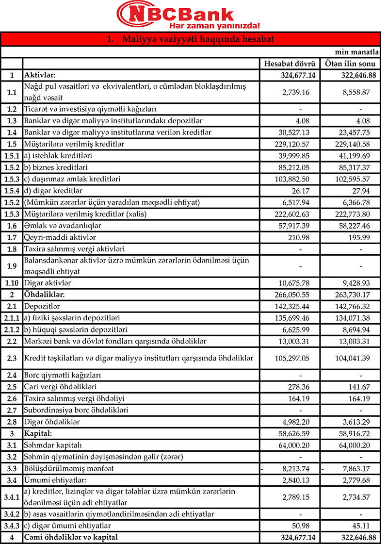 2019-cu ilin sonu ilə müqayisədə 2020-ci ilin ilk rübündə NBC Bankın cəmi aktivləri 2 milyon 30 min manat artaraq 31 Mart 2020-ci il tarixində 324 milyon 677 min manata çatıb.