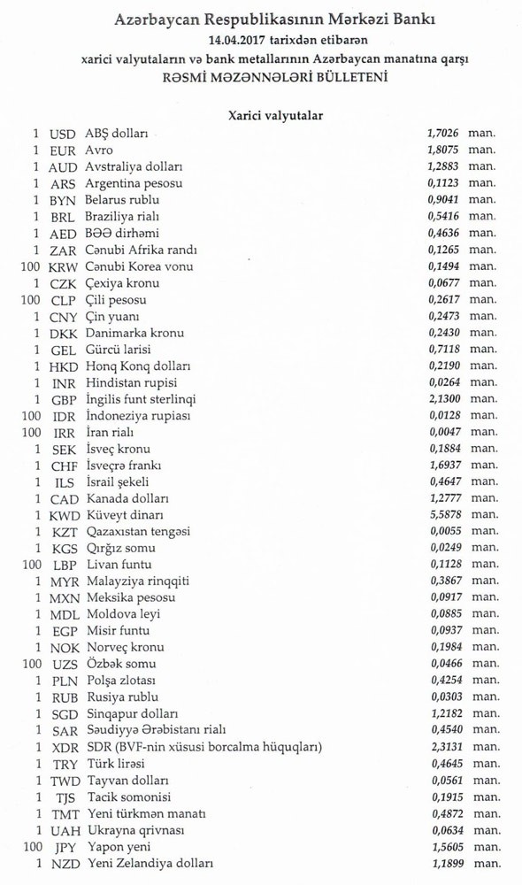 Aprelin 13-də rəsmi olaraq 1 dollar 1,7029 manata, 1 avro isə 1.8175 manata bərabər idi.