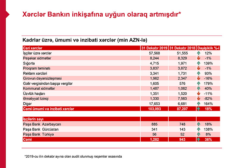 O qeyd edib ki, ötən il PAŞA Bank Azərbaycan-ın işçilərinin sayı 137 nəfər artaraq 885 nəfərə, PAŞA Bank Gürcüstan-ın işçilərinin sayı 198 nəfər artaraq 341 nəfərə, PAŞA Bank Türkiyənin işçilərinin sayı isə 4 nəfər artaraq 56 nəfərə yüksəlib.