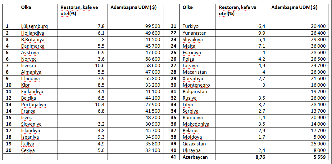 Məcmu gəlirlərdə restoran, kafe və hotellərə ən az pul ayıran isə Rumıniya (1,4%, 20 900 dollar), Moldova (1,7%, 5 000 dollar ) və Ukraynar ( 2,4%, 8 000 dollar) əhalisidir.