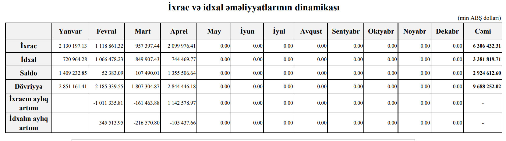 2020-ci ilin aprel ayında ixrac 2 milyard 99 milyon 976 min dollar, idxal 744 milyon 469 min dollar, saldo isə 1 milyard 355 milyon 506 min dollar təşkil edib. İdxalın azalması Apreldə da davam etmiş karantinrejimi ilə bağlıdır.
