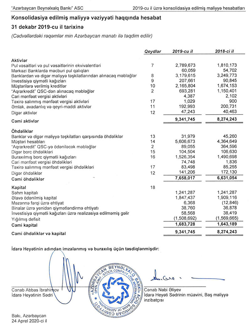 Bank 2019-cu ili ümumilikdə 215 milyon 708 min manat xalis mənfəətlə başa vurubAzərbaycan Beynəlxalq Bankı kənar auditorun bankın 2019-cu il üzrə fəaliyyət göstəriciləri barədə audit hesabatını ictimaiyyətə təqdim edib.