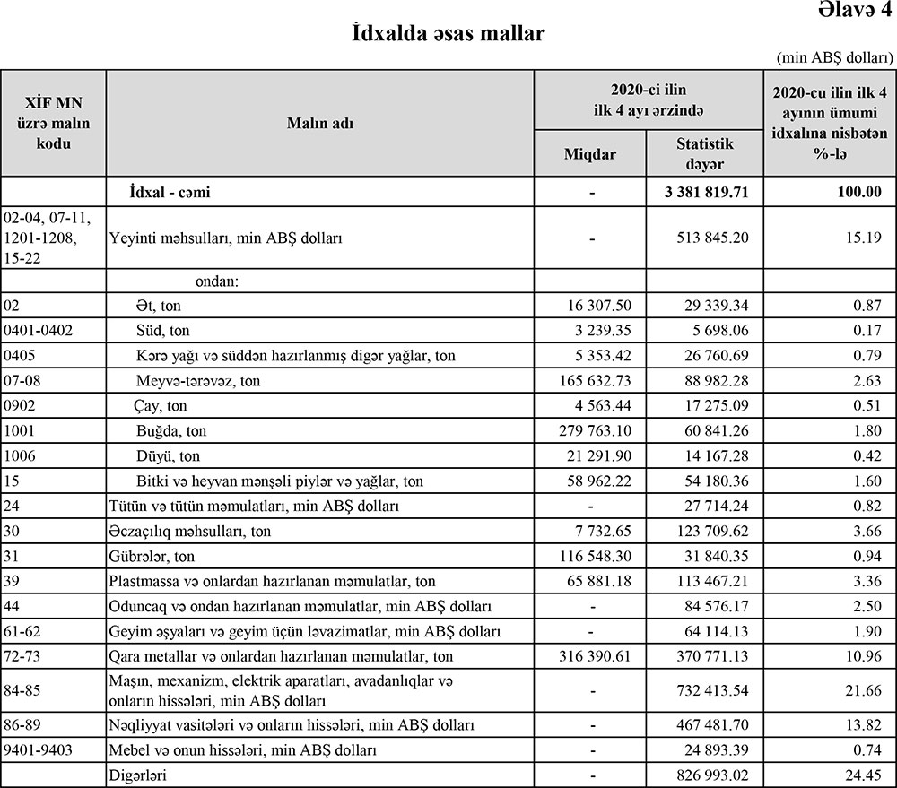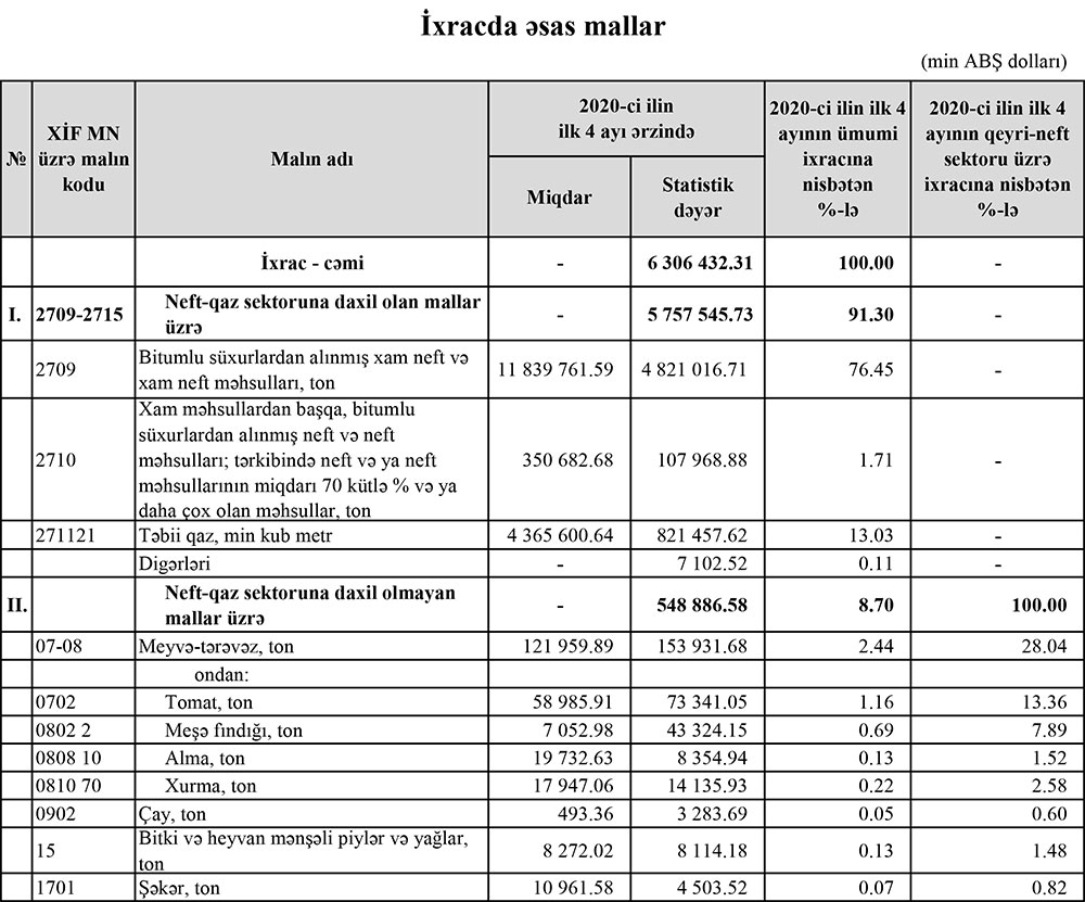 2020-ci ilin yanvar-aprel ayları ərzində (ilk 3ayda) Azərbaycanın ən çox ixrac və idxal etdiyi mallar.