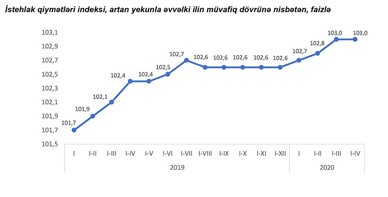 Apreldə Azərbaycanda illik inflyasiya 3%, aylıq inflyasiya 0,1%, illik ərzaq inflyasiyası isə 5,4% təşkil edib.2020-ci ilin yanvar-aprel aylarında istehlak qiymətləri indeksi 2019-cu ilin yanvar-aprel aylarına nisbətən 103,0 faiz, o cümlədən ərzaq məhsulları, içkilər və tütün məmulatları üzrə 105,4 faiz, qeyri-ərzaq məhsulları üzrə 101,2 faiz, əhaliyə göstərilmiş ödənişli xidmətlər üzrə 101,1 faiz təşkil etmişdir.